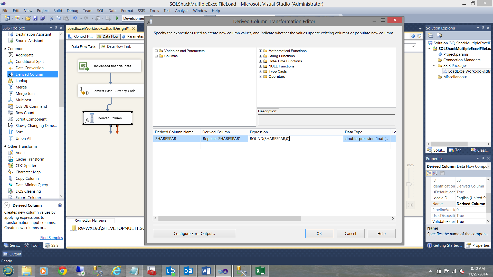 As my ‘par share” values are comma delimited and this often creates issues loading the values into SQL Server I have opted to add an additional step of transforming the data via a ‘derived column’. Yes, I could have altered the data format of the spreadsheet to be “un comma delimited” HOWEVER for this exercise I want to show you an alternate option.