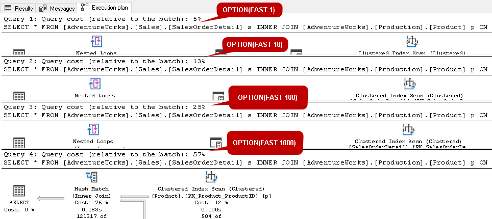 SET STATISTICS IO, TIME ON SELECT * FROM [AdventureWorks].[Sales].[SalesOrderDetail] s INNER JOIN [AdventureWorks].[Production].[Product] p ON p.ProductID = s.ProductID OPTION ( FAST 1); |