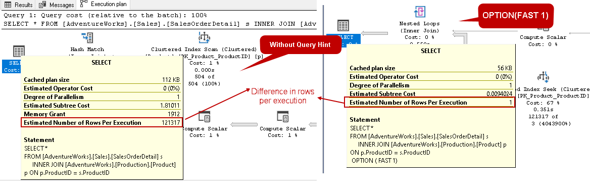 - In the other case, we force SQL Queries optimizer to use the query hint. It uses the 1 row as the estimated number of rows per execution. You might get quick results for the specified number of rows, but it put SQL Server query optimizer to prepare a poor execution plan