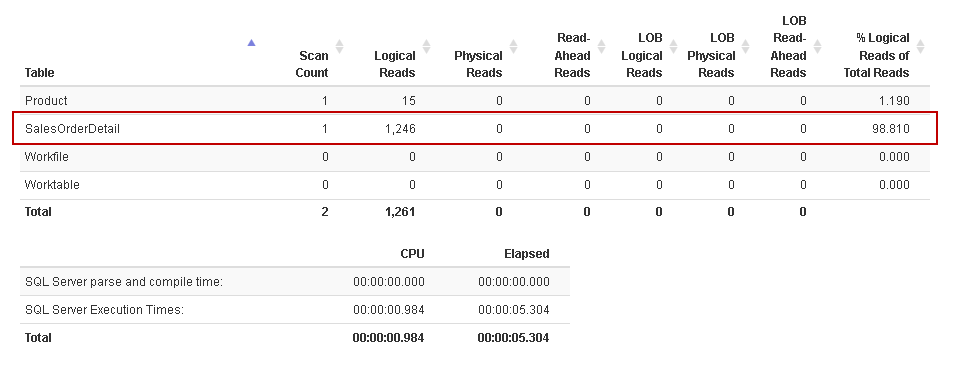 Here, you can see we have a total of 1261 logical reads, out of which 1246 logical reads are for the [SalesOrderDetails] table.