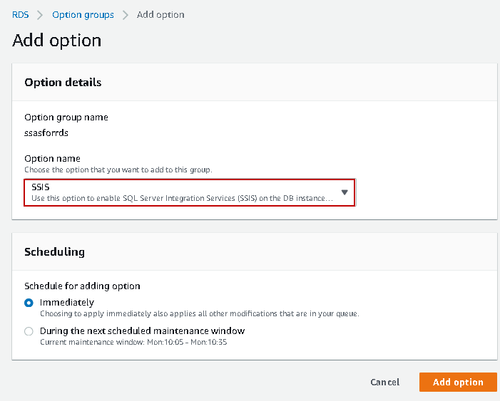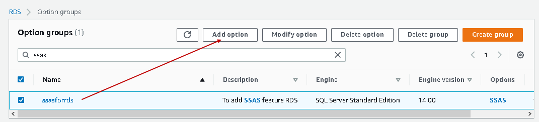 Navigate to the Option groups tab in the RDS dashboard, select the option group ssasforrds and click on the Add option button: