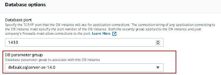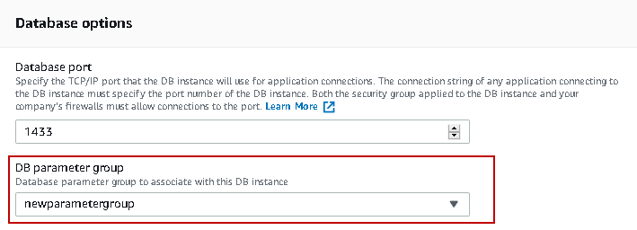 Now, go back to RDS instance and modify the option group from a default default.sqlserver-se-14.0 to new parameter group newparametergroup: