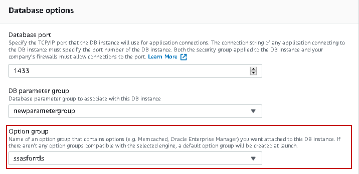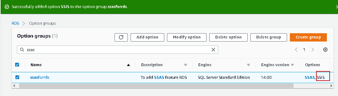 We do not need to change the option group in the RDS instance because we modified the existing option group. In case you create a new option group, modify the RDS instance to utilize the new option group having an SSIS feature.