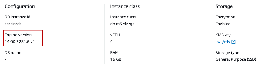 In this article, I use the AWS RDS SQL Server instance SQL Server 2017 version 14.00.3281.6.v1 standard edition, as shown below.