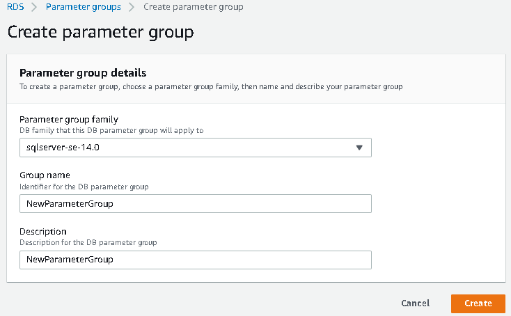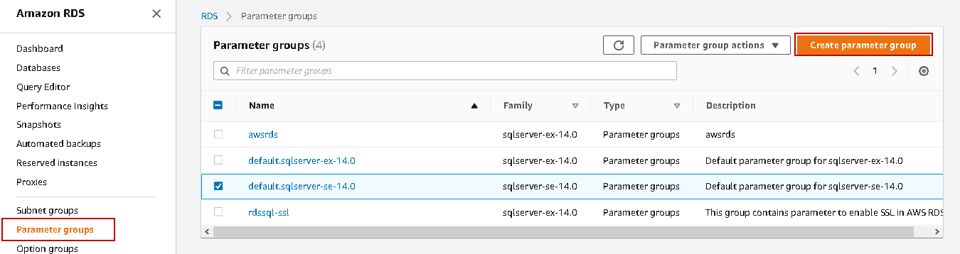 We cannot modify a default parameter group. We create a new parameter group with additional configuration. In the RDS dashboard, click on the Parameter groups taband create a new parameter group: