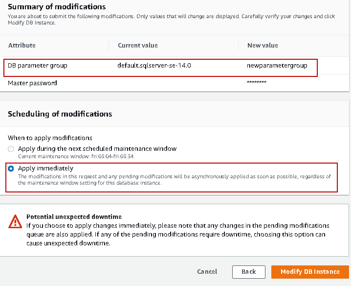 Verify the changes and apply them immediately. In case you do not want to apply it immediately, select to apply the changes during the next scheduled maintenance window. It also shows you the current maintenance window: