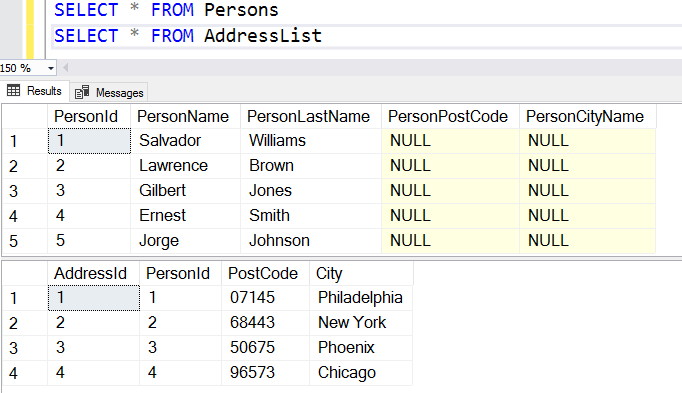 Now, in a new query window, execute the following update statement. It joins the [Persons] and [AddressList] columns and updates the records in the [Persons] table as per the corresponding matching row in the [AddressList] table.