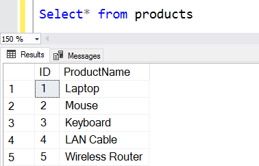 Use MyData Go Create table Products ( ID int identity(1,1) PRIMARY key clustered, ProductName varchar(20) ) Insert into Products ([Productname]) values ('Laptop') Insert into Products ([Productname]) values('Mouse') Insert into Products ([Productname]) values('Keyboard') Insert into Products ([Productname]) values('LAN Cable') Insert into Products ([Productname]) values('Wireless Router') |