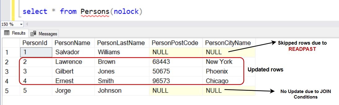 In the above section, we explored that READPAST ignores the locked rows while reading data from a table. In the article, How to UPDATE from a SELECT statement in SQL Server, we explored to update the records in a table using SQL Joins. It is like a combination of the select and update statements. To understand the issue with the READPAST here, create the [Persons] and [AddressList] table from the link shared above.