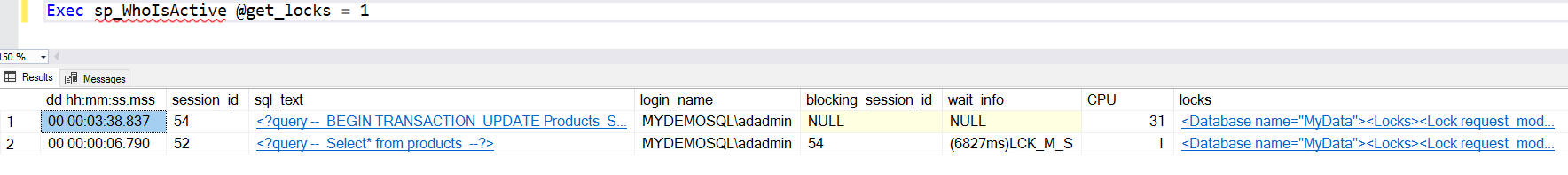 After executing the above update statement, check the locks using the Microsoft MVP Adam Machanic stored procedure SP_WHOISACTIVE. You can explore this procedure using this article, An overview of the sp_WhoIsActive stored procedure.