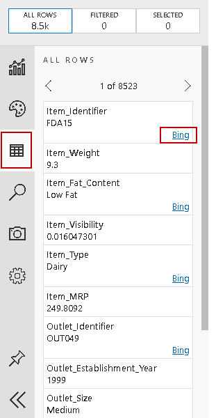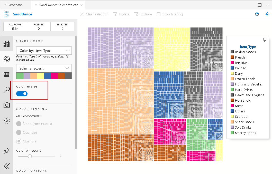 Once we click on View in SandDance, it automatically selects the column mapping as per predefined algorithms. In the above screenshot, we can see X-Axis column mapping for Item_Fat_Content.