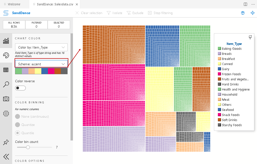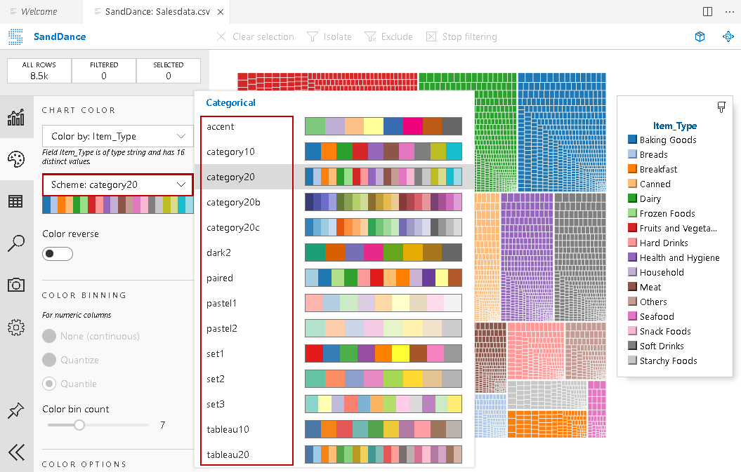 Chart color: We can choose a color scheme from a variety of available color schemes for all SandDance charts. By default, it uses a color scheme: category 20, as shown below: