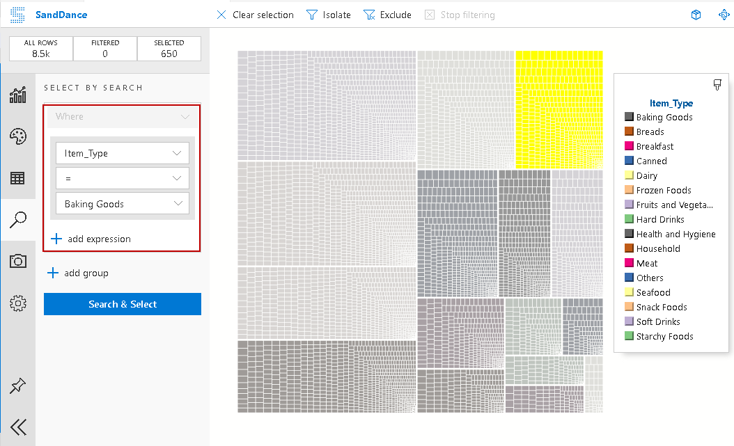 Select by Search: We can use Select by Search feature in SandDance for Azure Data Studio for filter data set by specifying various conditions. We can also use expressions in the search. For example, in the below screenshot, it searches for item type baking goods. It highlights the required portion in the chart: