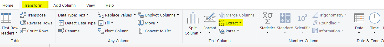 The other way to select the “Extract” function is via the “Transform” which is in the top menu as shown below.