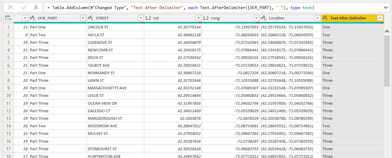 If you look at the newly created “UCR_PART_INTEGER” column you will see that it contains “ABC” before the column header name, which shows that it is a text column. However, the “UCR_PART_INTEGER” column now contains integers. To convert it to an integer type, click the “Detect Data Type” option from the “Transform” menu and you will see that the column type is changed to numbers as shown below:
