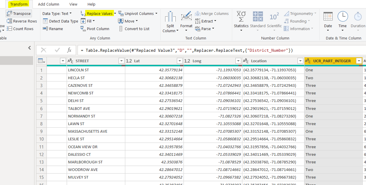 Since we want the DISTRICT column to contain numbers only, we will need to remove the letters by replacing them with empty spaces. To do this select the “Replace Values” option from the “Transform” menu.
