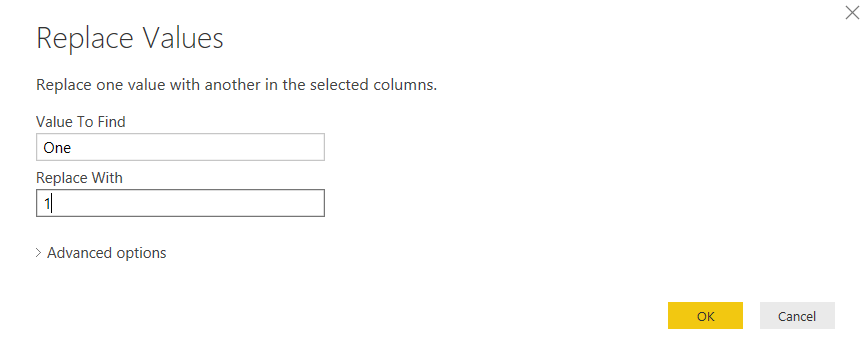 In the replace values dialogue box, replace the text “One” with the digit ‘1’. Repeat the same step to replace “Two” with 2, “Three” with 3 and so on.