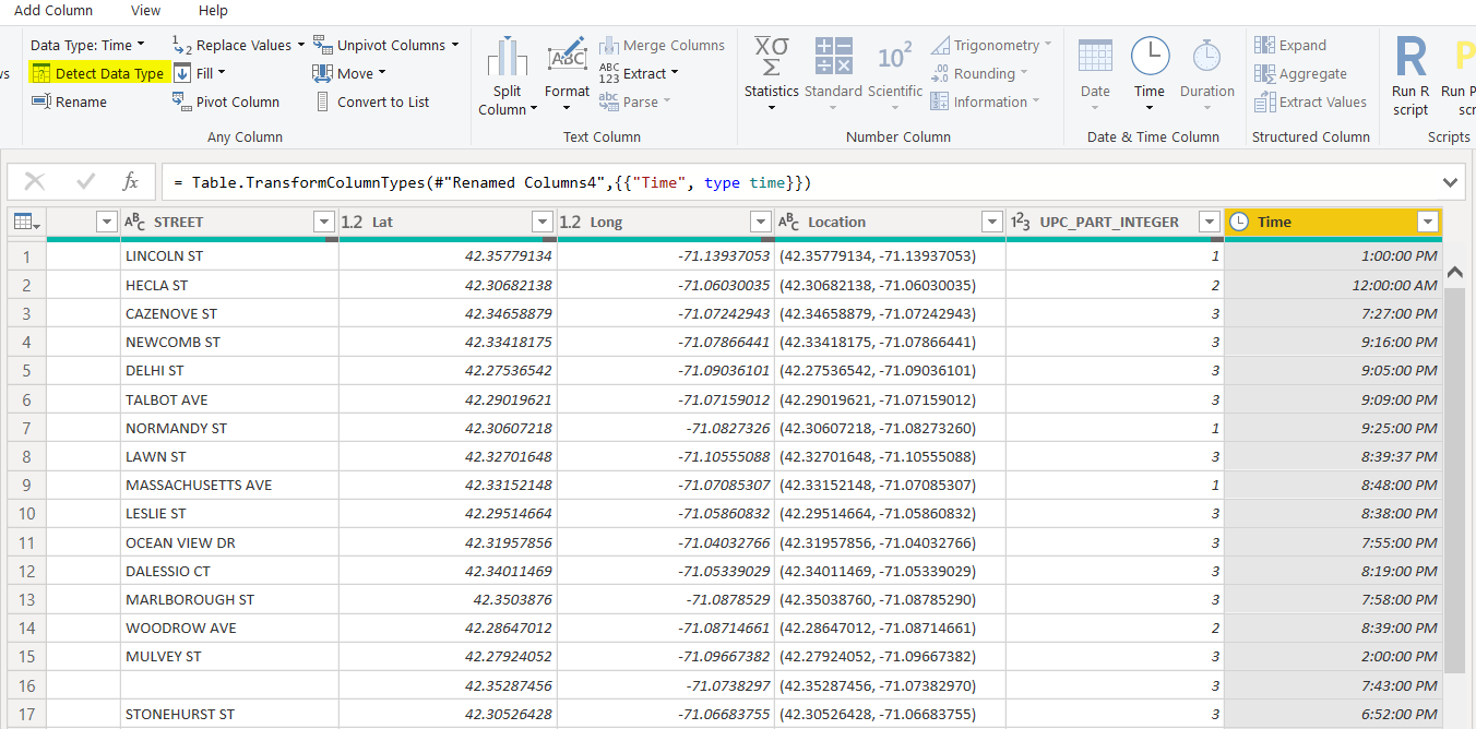 The type of the newly created time column is “Text” at the moment. Again click the “Detect Data Type” option from the “Transform” menu, the “Time” column will be converted into a date-time column. This is shown by the clock icon which will now be visible before the column name in the “Time” column. Look at the following screenshot for reference.