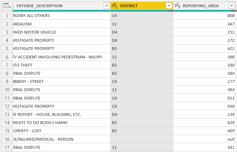 Finally, remember to change the type of the DISTRICT column from text to numeric by using the “Detect Data Type” option from the “Transform” menu.