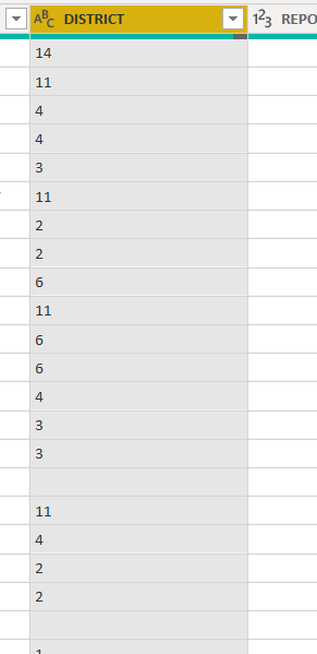 Let’s transform the DISTRICT column by extracting only the numbers from the DISTRICT column. If you look at the DISTRICT column it contains the alphabet A, B, C, D or E, followed by a single- or two-digit number.