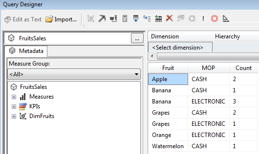 123456789SELECT NON EMPTY { [Measures].[Count] } ON COLUMNS,NON EMPTY{( [DimFruits].[Fruit].[Fruit].AllMembers ) *{ StrToMember ( @MOP ) }} ON ROWSFROM [FruitsSales]Script 2: MDX Script Using STRTOMEMBER