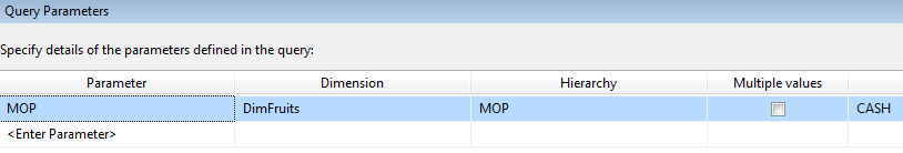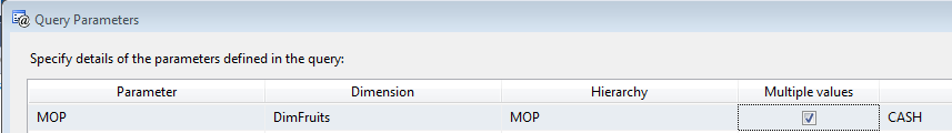 The dataset parameter name (and subsequently, report parameter name) is not business friendly as it is derived from a concatenation of dimension name (DimFruits) and dimension member (MOP).