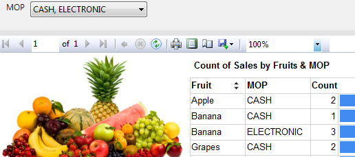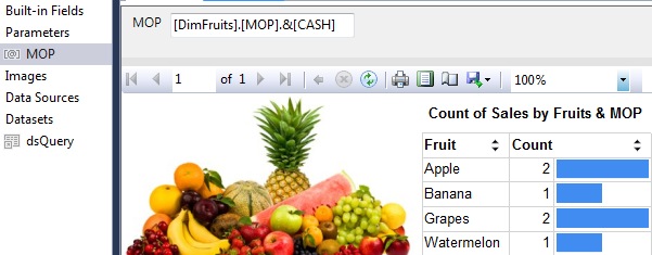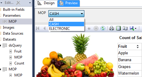 1234567891011121314WITHMEMBER [Measures].[Label] AS[DimFruits].[MOP].currentmember.member_captionMEMBER [Measures].[Value] AS[DimFruits].[MOP].currentmember.uniquenameSELECT{[Measures].[Label],[Measures].[Value]} ON COLUMNS,[DimFruits].[MOP].allmembers ON ROWSFROM [FruitsSales]Script 3: MOP Lookup MDX Query The updated report which references the newly added dataset is shown in Figure 6. As it can be seen, this view of the report allows end users to choose the method of payment without having to specify an MDX expression.