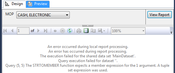 Figure 5 Evidently, we still have an issue of a predefined parameter value that contains MDX expression. We need to refactor this in such a way that it displays member value only (i.e. CASH, ELECTRONIC etc.). We can do this by having the MOP parameter populated by a separate lookup dataset. Script 3 shows an MDX script for a dataset that will be used to populate the MOP parameter.