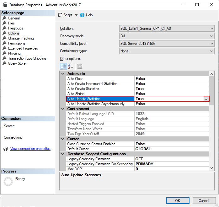 SQL Server automatically creates statistics when we create an index on a table or indexed view. At the same time, the query optimizer can decide to create statistics for the non-indexed individual columns during the execution process of the queries. However, this option can work if the Auto Create Statistics option of the database is enabled. Auto Create Statistics option can be seen under the options tab of the database properties.