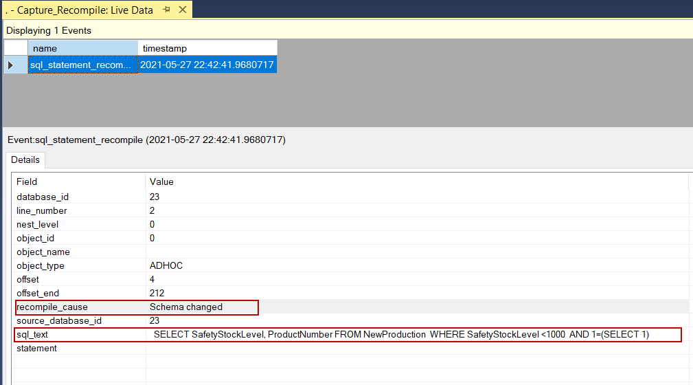 On the other hand, the extended event has captured a recompilation of a query. The reason for the recompile operation is Schema change and the sql_text field value shows our example query.