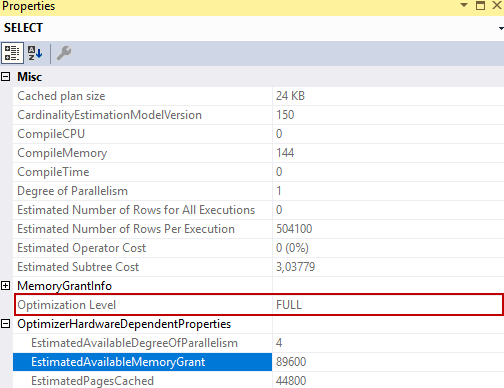 When we review the execution plan of the query, we will see that the Optimization Level attribute shows a FULL value. It means that all optimization steps were completed by the optimizer.