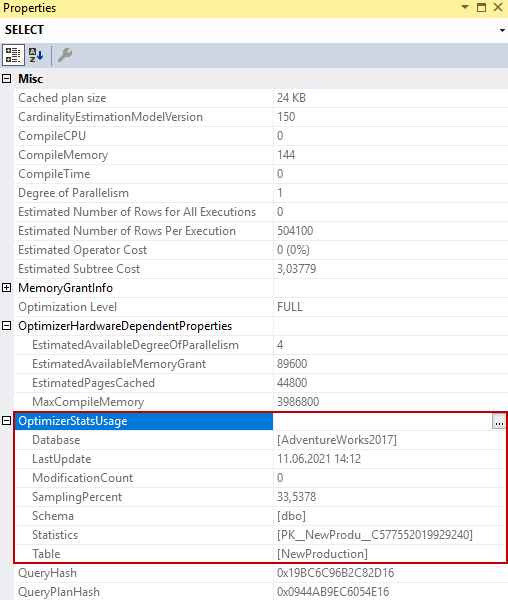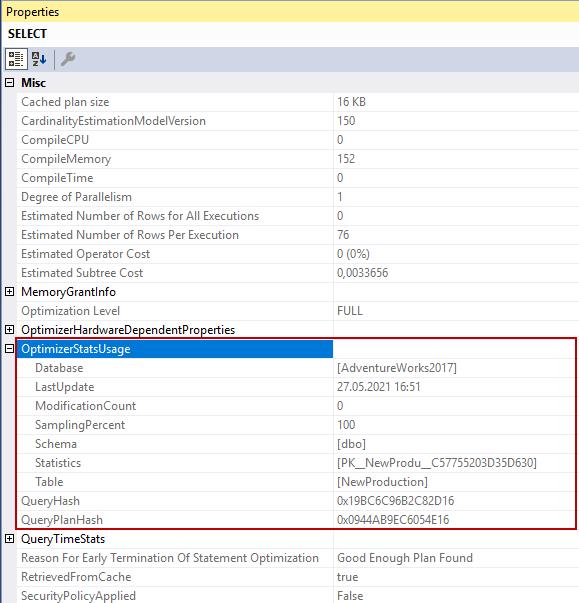 At the same time, we can find out which statistics are used during the execution of the query by the use of the OptimizerStatsUsage attribute.