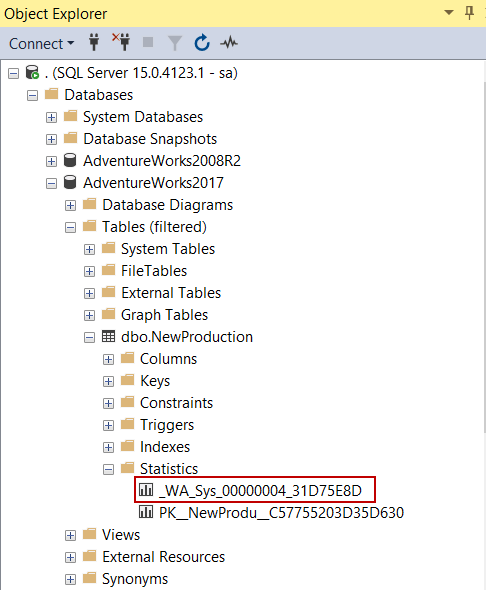 As we stated, after creating an index SQL Server automatically creates statistics for this index. Moving from this point, we can expect that SQL Server creates statistics for the primary key of the NewProduction table. By default, when we create a primary key constraint SQL Server automatically creates a unique clustered index. In the SQL Server Management Studio (SSMS), we can see the SQL Server statistics under the Tables subfolder.