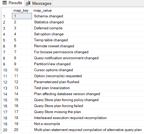 SELECT map_key , map_value from sys.dm_xe_map_values as dxmv where dxmv.name=N'statement_recompile_cause' |