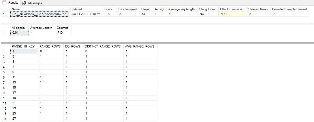 SELECT * FROM NewProduction WHERE PID > 24 GO DBCC SHOW_STATISTICS ('NewProduction','PK__NewProdu__C57755203D35D630') |
