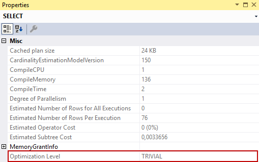 The issue is hidden in the query execution plan. In the execution plan of this query, we can see that the Optimization Level attribute of the query is TRIVIAL.