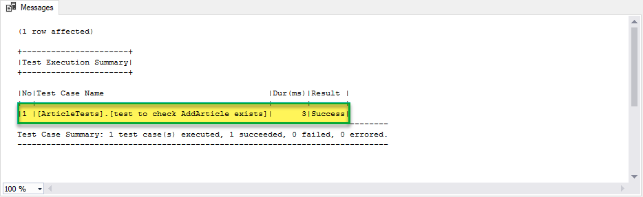 -- Rerun ArticleTest test class EXEC tsqlt.RunTestClass "ArticleTests" |