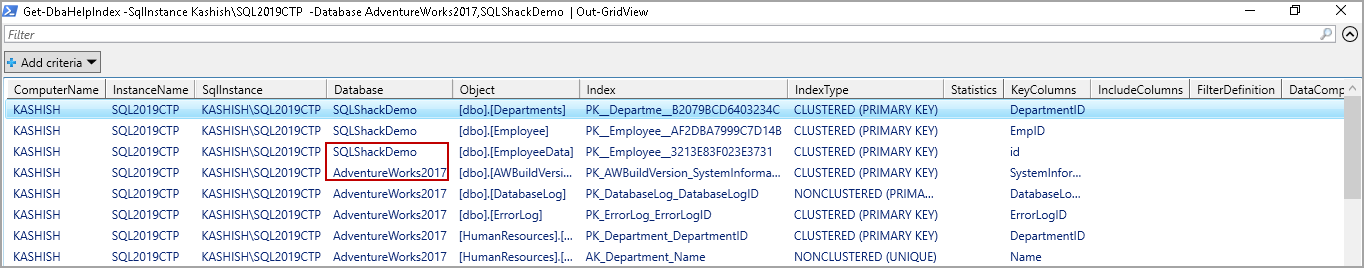 > Get-DbaHelpIndex -SqlInstance Kashish\SQL2019CTP -Database AdventureWorks2017,SQLShackDemo | Out-GridView |