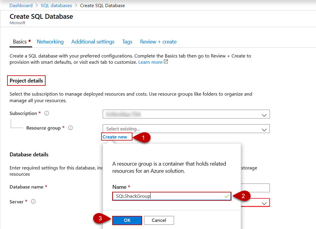 On the Create SQL Database page, firstly, we can choose an existing resource group or we can create a new one. For this demonstration, we will create a new resource group for the Azure SQL database.
