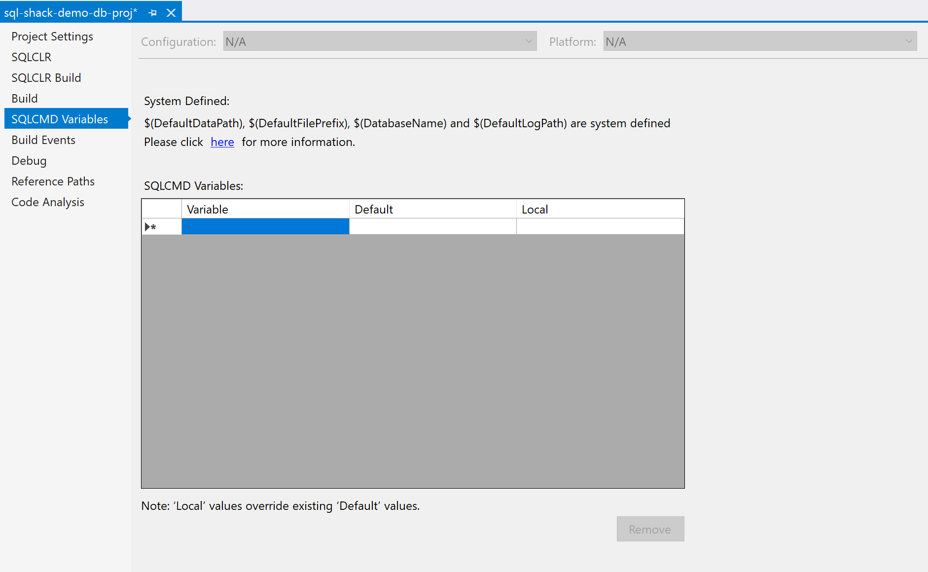 Another important property is to set the SQLCMD variable for the data tier application. These variables are used to define values in the database that can be set at runtime. In a later article, I will explain in detail about using the SQLCMD Variable and how to dynamically assign values using these variables while deploying the database project.