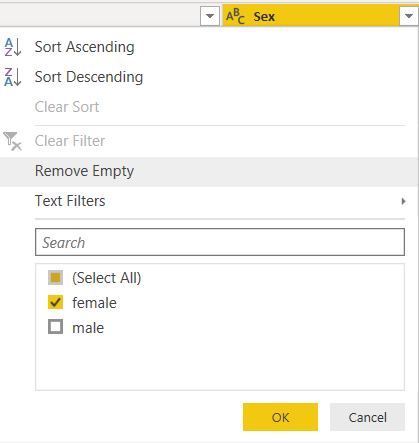 You can also apply filters on the text column. For instance, if you only want to keep the records of the Female passengers, uncheck “male” checkbox from the Sex column filters, as shown below.
