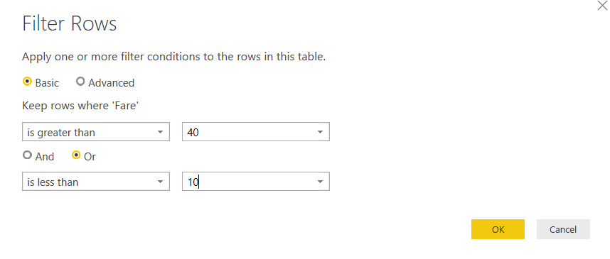 You should see the following window. Add 40 and 10 in the corresponding fields and click OK button. You will see that the dataset will now contain only the rows where the Fare column has a value greater than 40 or less than 10.