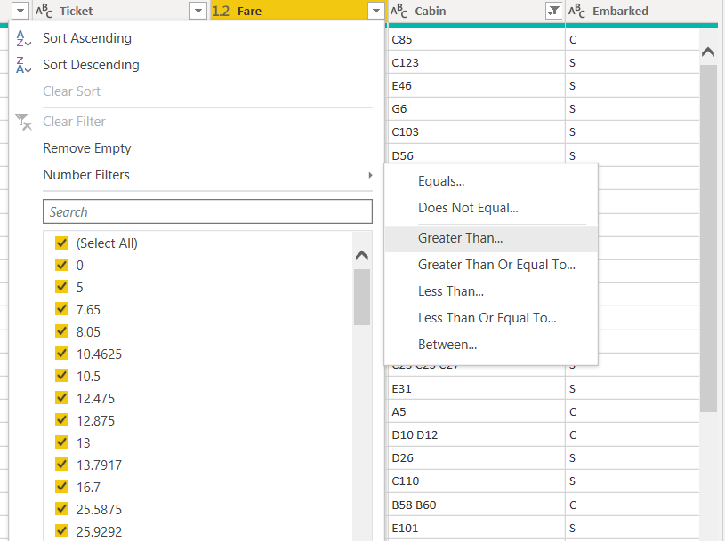 You can also remove rows based on values in a particular column. For instance, if you want to only keep the rows where the Fare column has values either greater than 40 or less than 10, you can use the Number Filter property. To do so, click on the triangle on the left of the Fare column name and then click on the “Number Filters” property. A dropdown list will pop up, select “Greater Than” from the list as shown below: