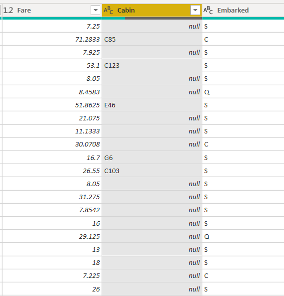 If you look at the Titanic dataset in the Query Editor, you can see that the Age column contains some null values as shown below: