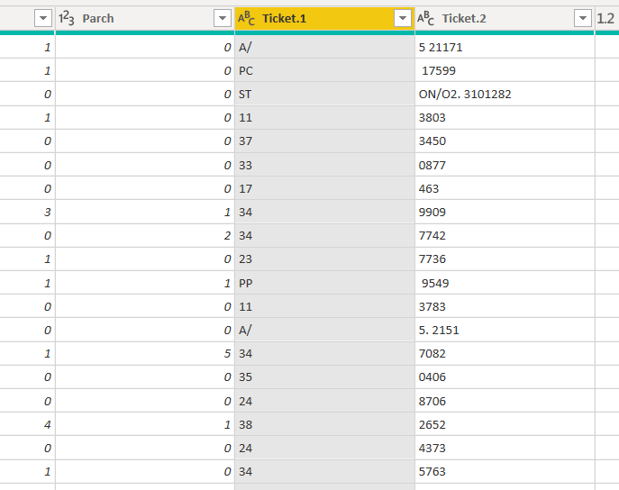 Once you split the columns, you should see two new columns, Ticket.1 and Ticket.2, as shown below: