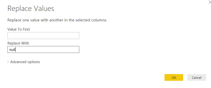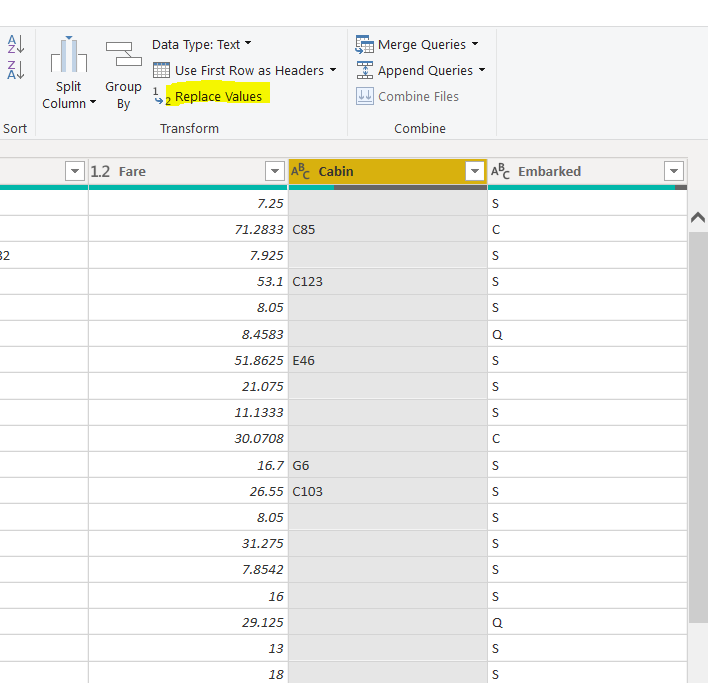 You can replace values in a particular column via the Query Editor in Power BI. For instance, to replace the blank rows in the Cabin column containing a null value, you first need to select the Cabin column and then click the Replace Value option from the top menu as shown below: