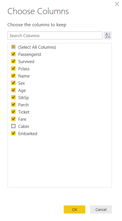 Like rows, you can also remove columns that you do not want in your dataset. For instance, the Cabin column in the Titanic dataset contains many null values. We can remove it. To do so, click the “Choose Column -> Choose Columns” option from the top menu, as shown below.