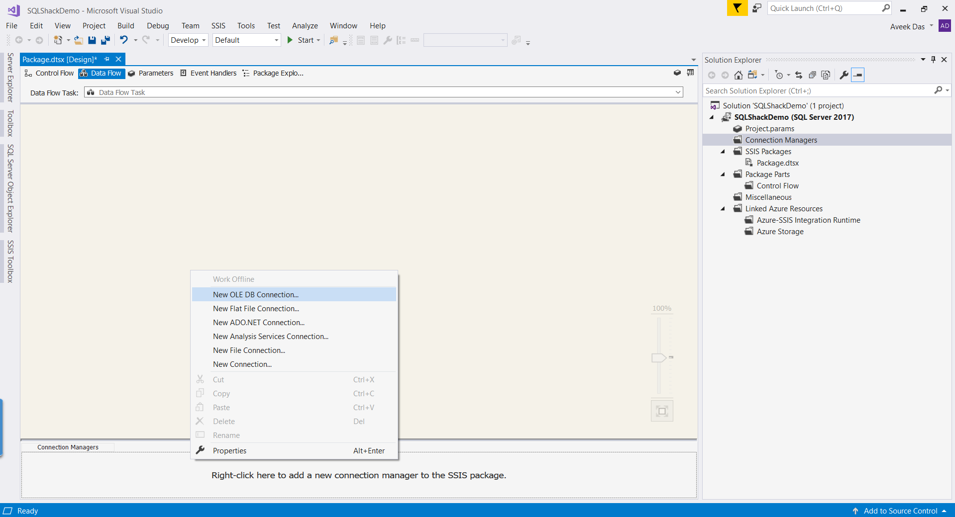 Let us begin by adding the connection manager to the SSIS project. Right-click on the panel to create both the connection managers as follows.