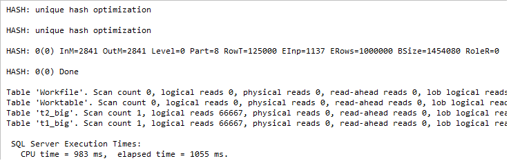 After theoretical part, let’s do some action and observe how it works. We’ll start with a simple hash join that fit in memory. For the purpose of demonstration, I’ll create two rather big heap tables, 1 000 000 rows each. With the help of TF 7357 we will see some execution details.