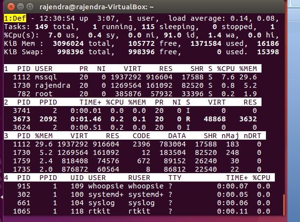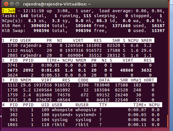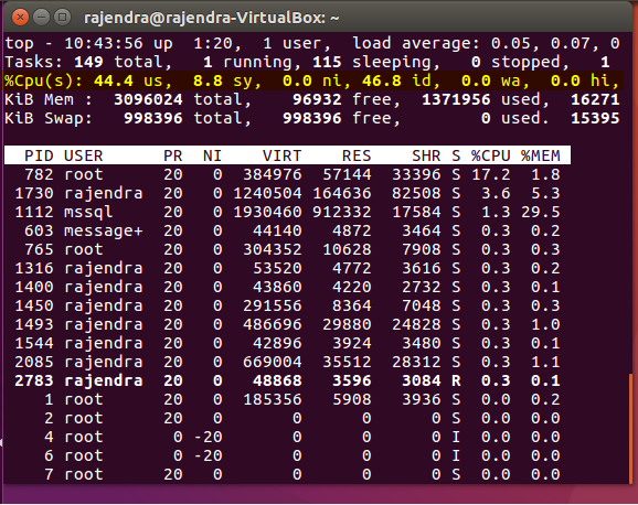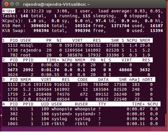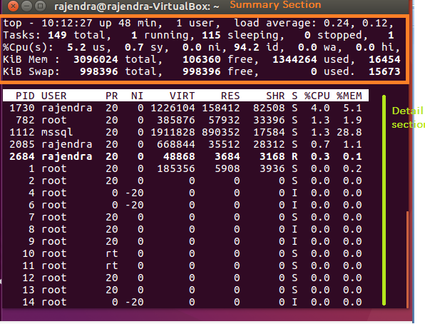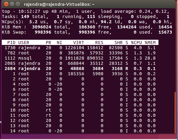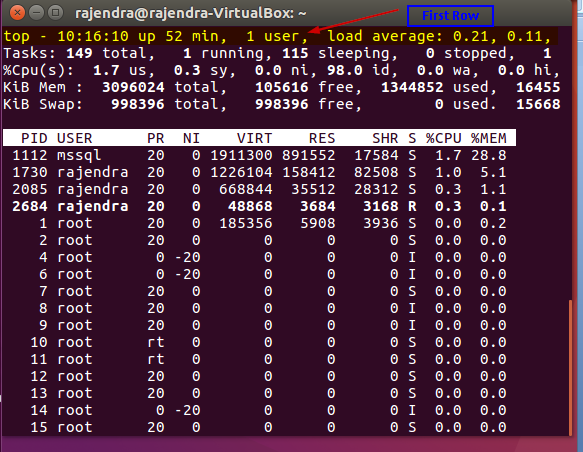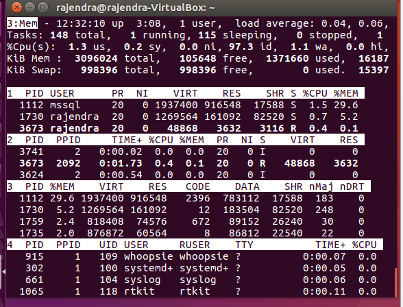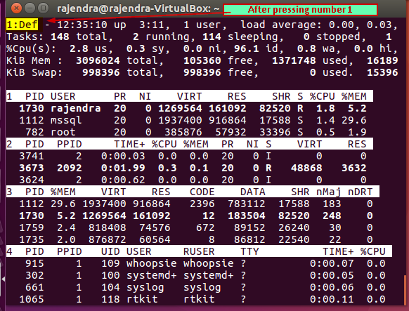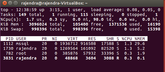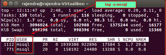 - Filter result based on the user id: We can filter out the result specific to user id with the ‘u’ option. For example, if we want to filter out the top command results for the ‘mssql’ user, we can run below command